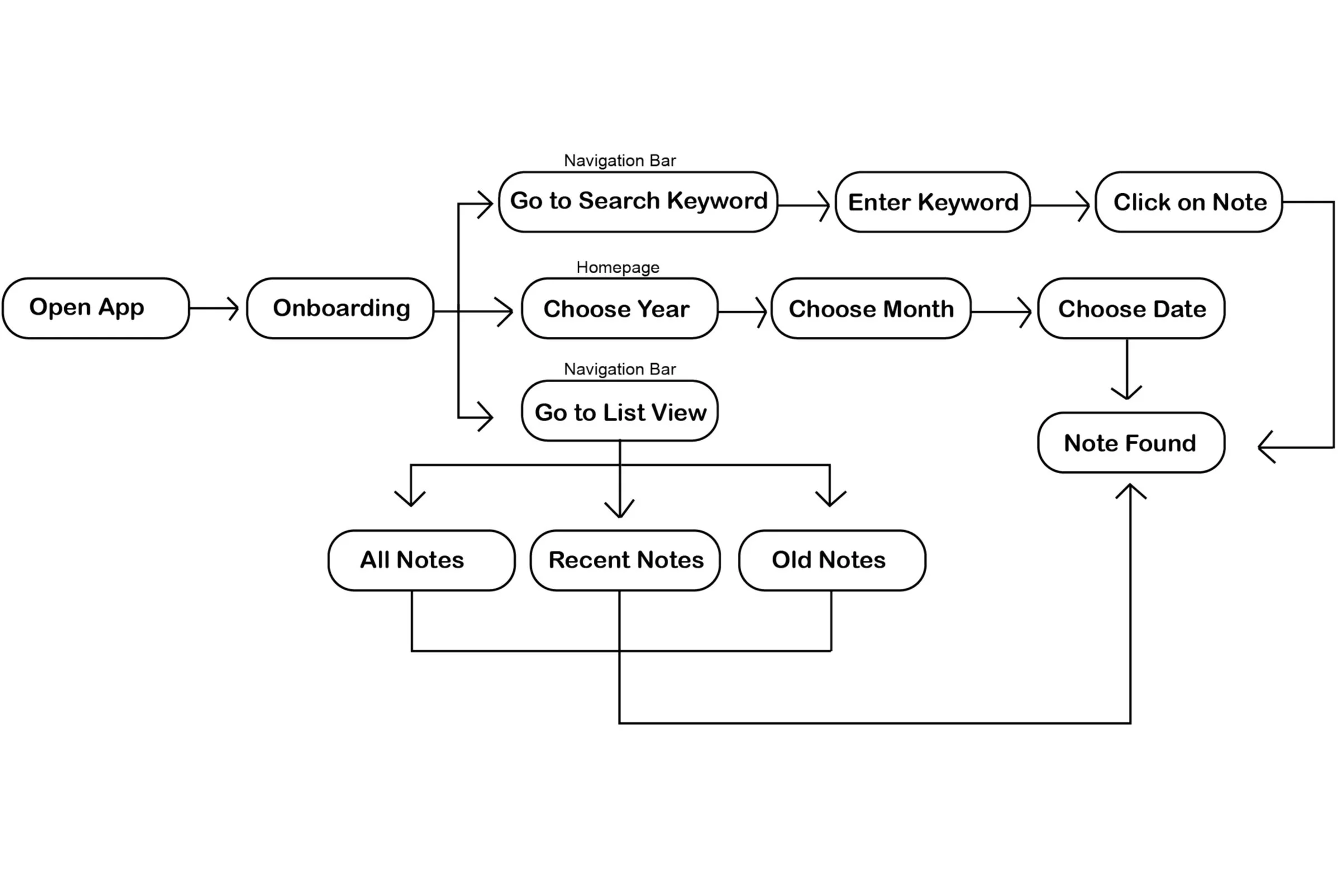 Following these concerns I developed a user flow diagram to illustrate how users navigate through the note-taking app. This diagram maps out the key interactions, decision points, and overall user journey, ensuring that the app effectively addresses user needs and pain points.